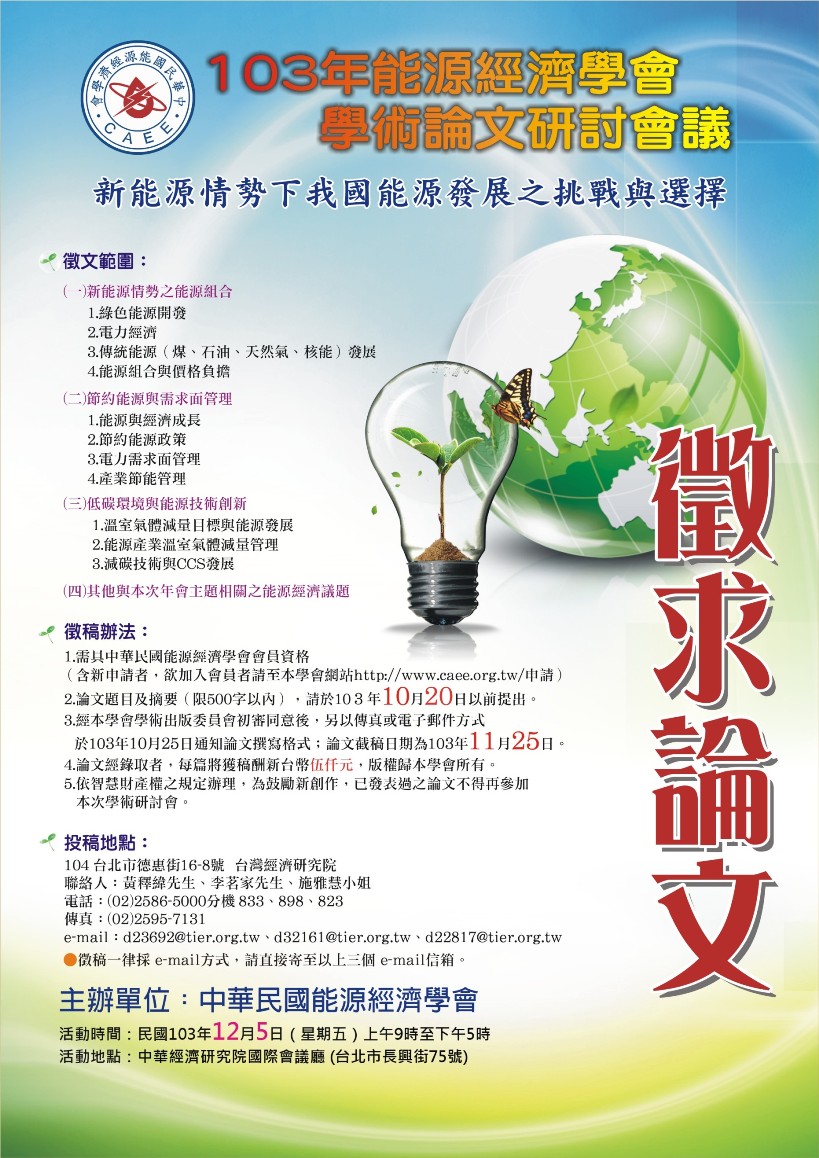 Copyright @ 2009 Chinese Association for Energy Economics 中華民國能源經濟學會 交通位置圖 地址:110207信義區松仁路3號11樓 電話:(02) 8725-8596 Mail:caeetw2011@gmail.com